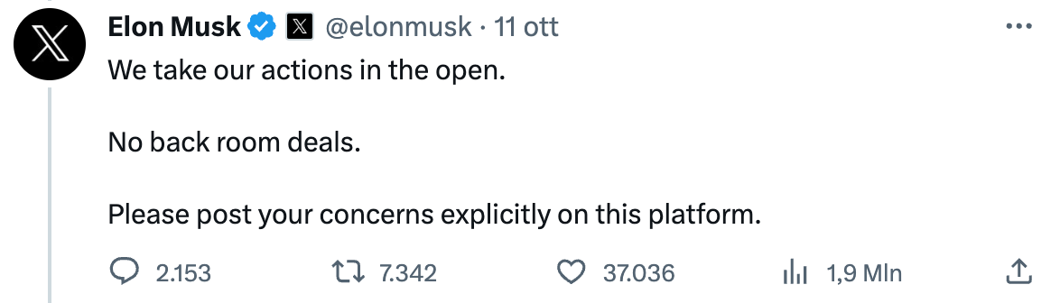 Come era naturale aspettarsi, l’unico ad aver risposto su Twitter è stato Musk che ha detto che la "politica dell'azienda prevede che tutto sia open source e trasparente, così come piace tanto all’Europa", ha poi chiesto a Breton di indicare le violazioni a cui si fa riferimento nella lettera e affermato che X non avrebbe preso parte ad accordi sottobanco.